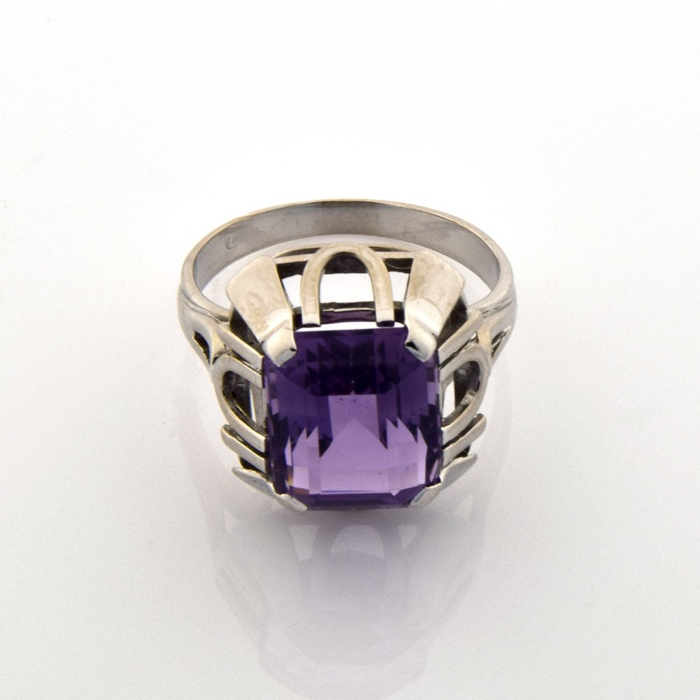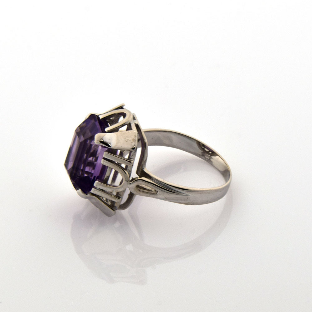 Bei dem Schmuckstück handelt es sich um einen Ring aus 585 Weißgold mit einem Amethyst im Treppenschliff.