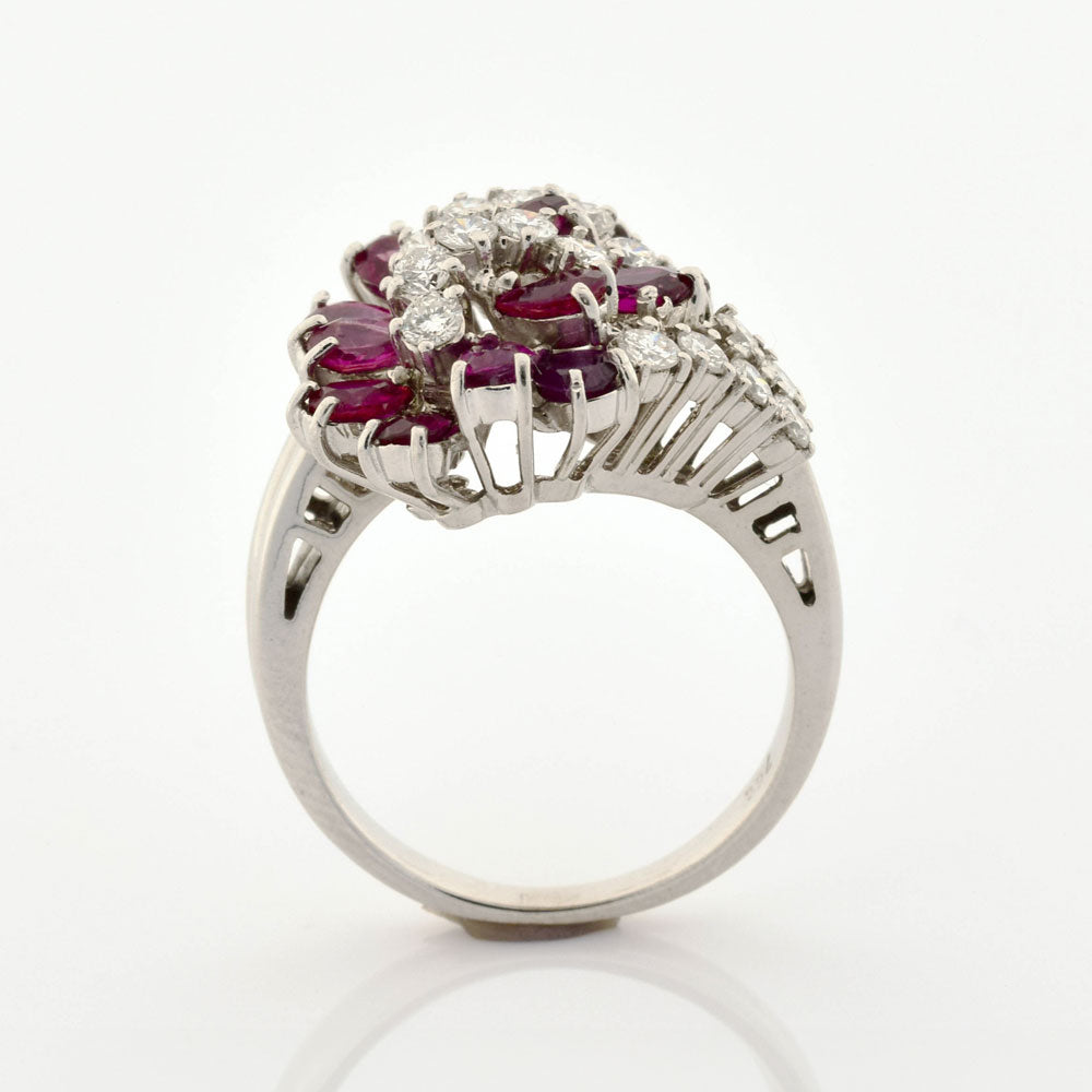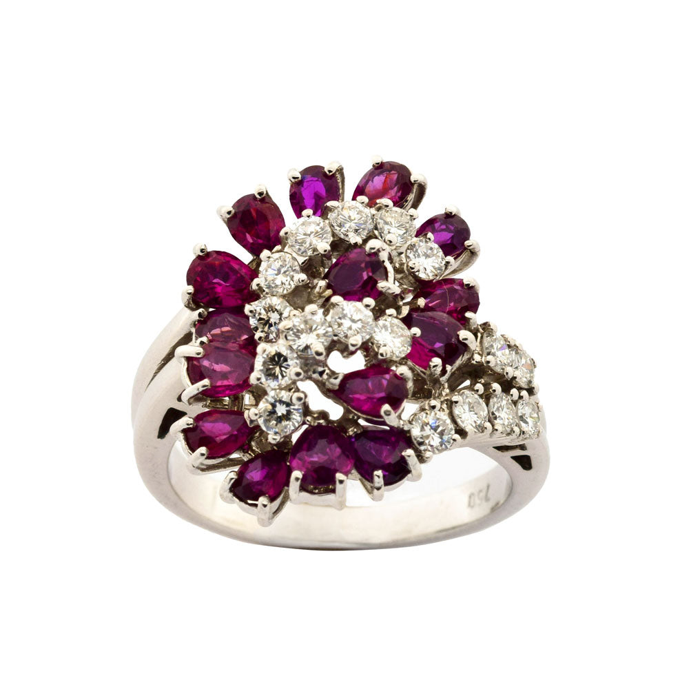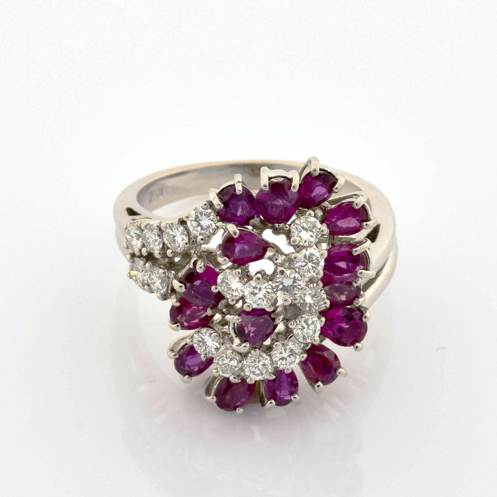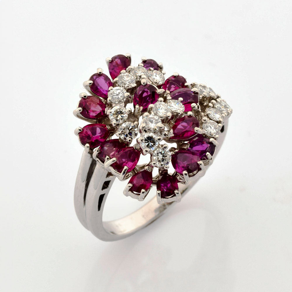 Bei dem Schmuckstück handelt es sich um einen Ring aus 750 Weißgold mit 15 Rubinen im Tropfenschliff und 17 Brillanten von zusammen ca. 0,68 ct in der Qualität Weiß mit kleinen Einschlüssen (W/si).