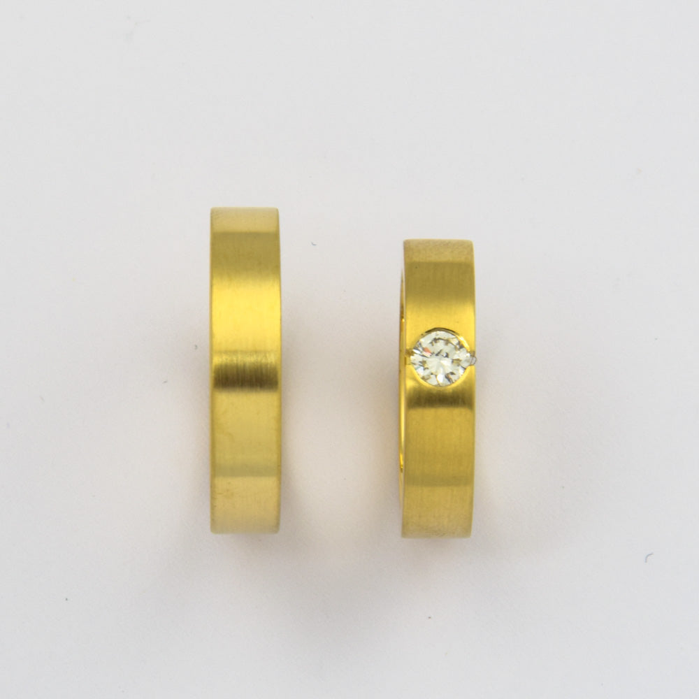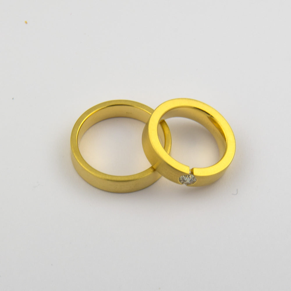 Bei dem Schmuckstück handelt es sich um ein Paar Trauringe aus 585 Gelbgold mit einem Brillanten von ca. 0,23 ct in der Qualität Weiß mit kleinen Einschlüssen (W/si).